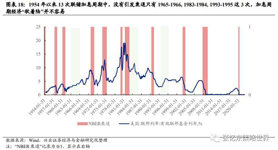 加息周期之下,经济“软着陆”并不容易。1954年以来13次联储加息周期中,没有引发衰退只有1965-1966, 1983-1984, 1993-1995这3次。