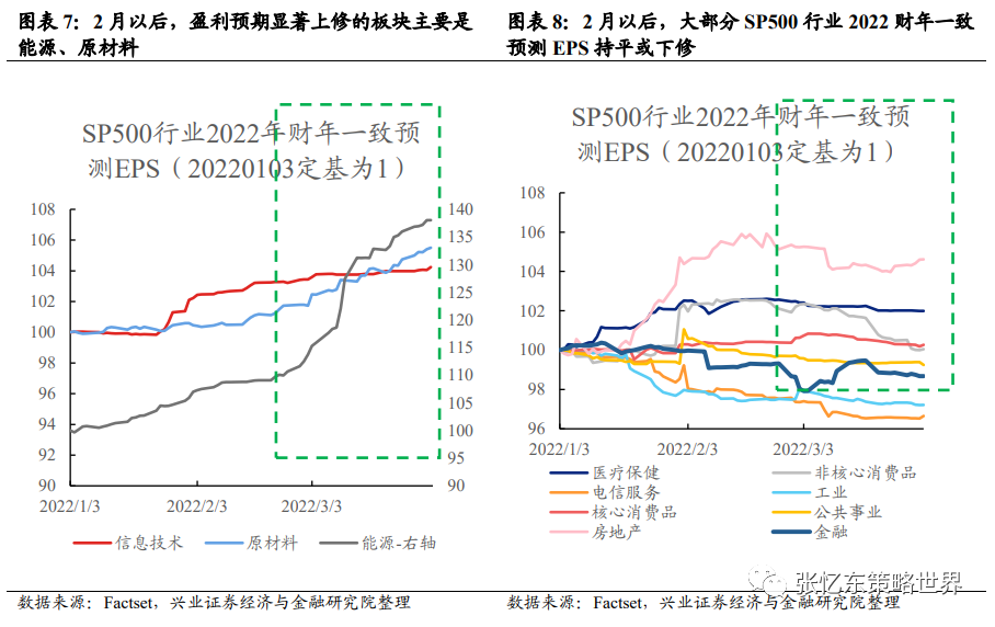 行业来看,大部分SP500行业2022财年一致预测EPS持平或下修,盈利预期显著上修的板块主要是能源、原材料,这一上修也是有明显的基本面支撑;并且,与宏观经济景气度关联度高的板块比如金融、可选消费,市场已经在预计负增长。截至20220401,根据彭博的一致预测,1季度利润同比增速来看,金融业-22.7%,可选消费-11.3%,通信-3.4%,必选消费-0.6%(此外,能源同比+253.4%、原材料+32.2%、工业+32.0%、房地产+14.0%、医疗保健+10.9%、信息技术+8.1%、公用事业+7.4%)。