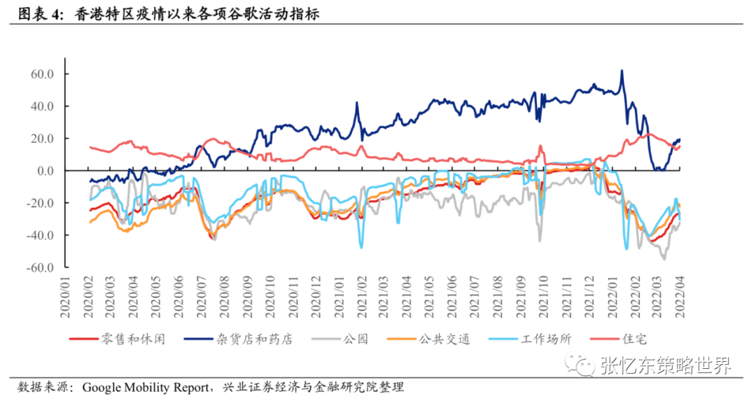 3月下旬,随着疫情见顶回落,谷歌活动指数显示香港零售休闲、工作场所、公共交通等高频指标均有见底回升迹象。3月下旬之后随着疫情缓解、港股市场整体情绪改善,本地股行情出现反弹。