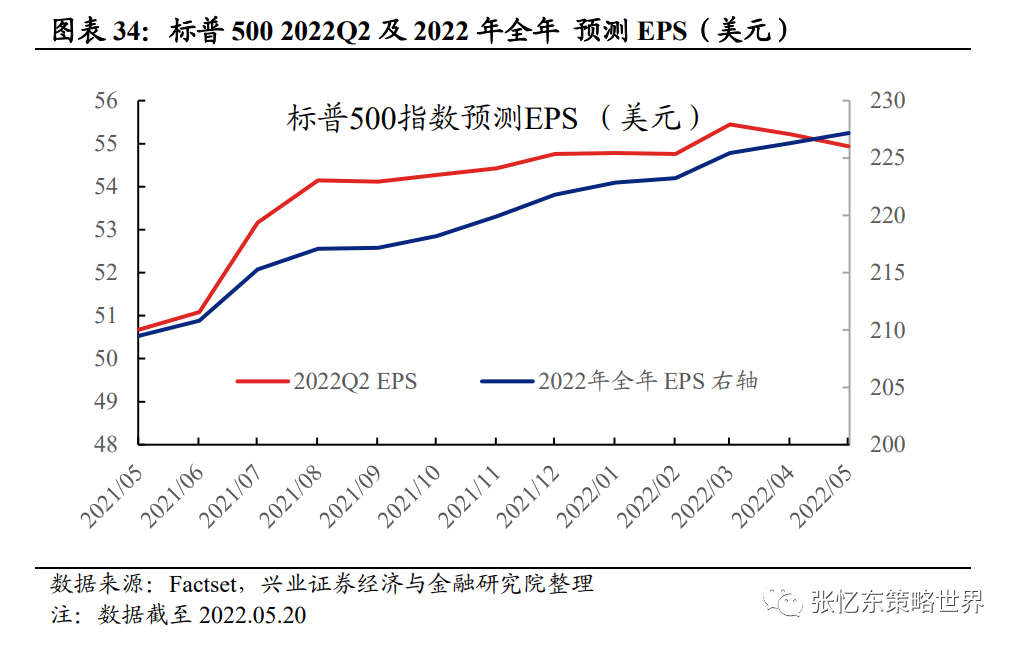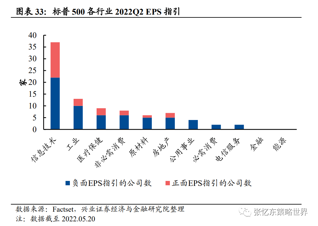截至 5 月 20 日,标普 500 成分股中共 88 家公司发布了 2022Q2EPS 指引, 其中,62 家公司给出了负面的 EPS 指引,26 家给出了正面的 EPS 指引。