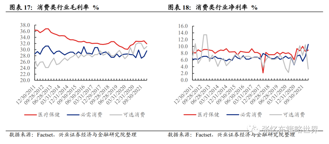 2.2、消费类行业:美国一季度消费稳健,支撑必需消费与可选消费收入增速维持高位。1)医疗保健:新冠疫苗需求支撑行业业绩。2)必需消费:收入增速、盈利能力均为2011年以来的高位。3)可选消费:绝大多数行业净利润规模均已超过疫情前水平。可选消费的盈利逊色主要是受亚马逊拖累。4)由于供应链问题和通胀所造成的成本上涨,美股零售巨头盈利大幅下滑,引发股价大跌。2022Q1(自然年度),沃尔玛净利润同比下降25%,股价在业绩发布当日下跌11.38%;塔吉特净利润同比大幅下滑51.9%,股价暴跌24.93%。