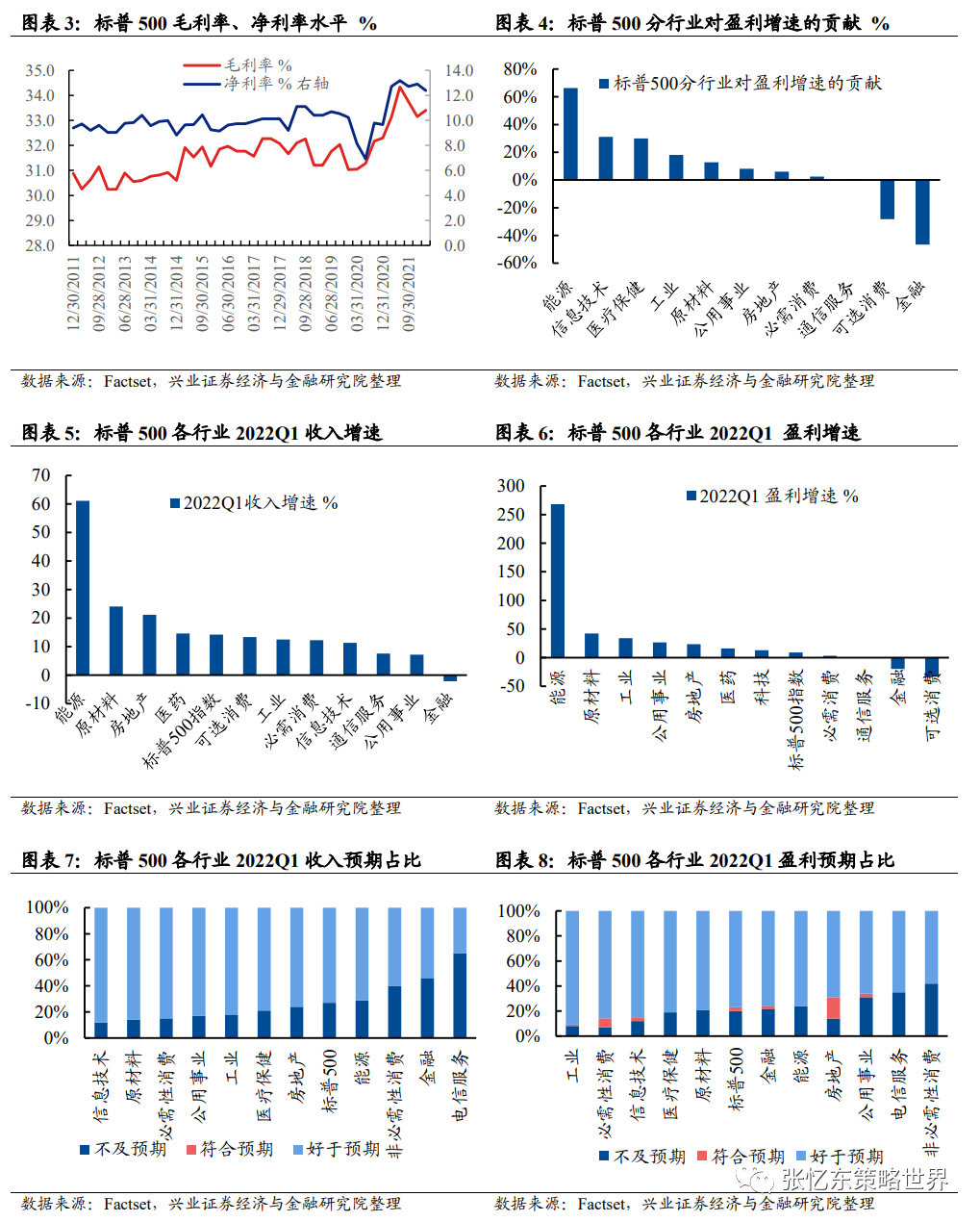 1、2022Q1,美股整体盈利能力处于历史高位,但隐忧开始呈现。截至5月20日,标普500指数成分股公司中,共479家公司(占比95%)发布了最新财报(注:美股财报披露由上市公司自行决定,季报的长度、起止时间都不相同,为方便分析,我们把4月至今的最新财报统称为一季报),整体来看: