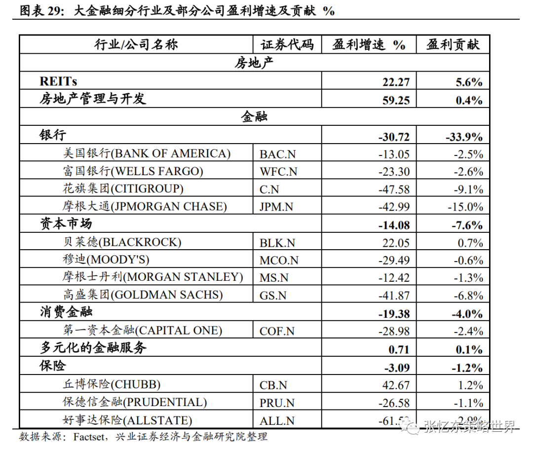 从对标普500盈利同比增速贡献的角度来看,能源对盈利同比增速的贡献高达66.2%,其次为信息技术31.0%,第三为医疗保健30%;金融(-46.4%)、可选消费(-28.3%)拖累最大。