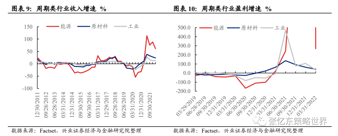 行业上,周期类业绩表现亮眼,可选消费和金融表现相对糟糕。从收入同比增速角度来看,能源(+61%)、原材料(+24%)、房地产(+21%)增速较高,而通信服务(+7.6%)、公用事业(+7.1%)、金融(-2.1%)表现较弱。盈利同比增速角度,能源盈利同比增长268.2%,遥遥领先于其他行业,可选消费和金融盈利同比下滑,分别下降33.3%、19.9%。