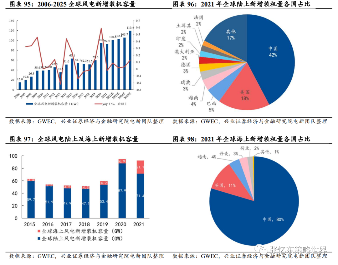 中国是新能源的最大市场,其中,中国是全球最大的风电市场,2021年全球陆上新增装机量中国占比42%,2021年全球海上新增装机量中国占比80%;中国也是全球最大的光伏市场,2021年全球光伏装机容量中国占比31%。