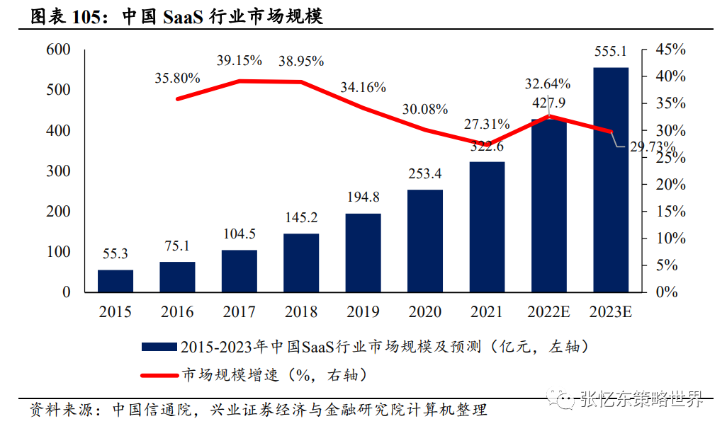 SaaS:行业保持高增速。当前国内各领域SaaS渗透率不高,各类软件均在朝SaaS化转型,根据信通院统计,2021年中国SaaS市场规模为322.6亿元,预计2022年市场规模达到427.9亿元人民币,同比增长32.64%,2023年市场规模达555.1亿元人民币,同比增速为29.73%。行业保持高增速。