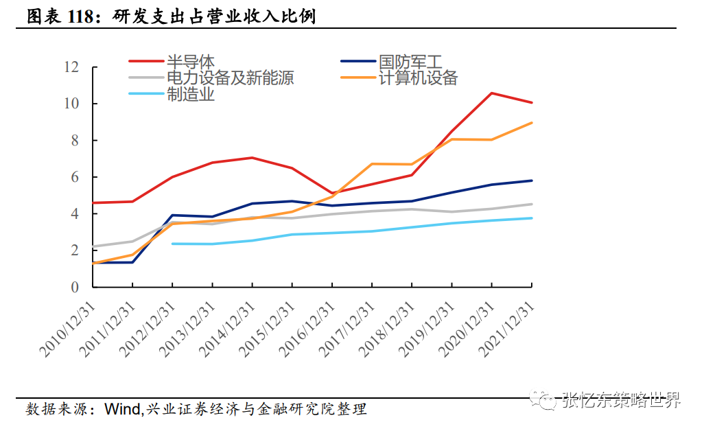 半导体、计算机设备、国防军工等行业近年来研发强度持续提升,驱动先进制造资本开始持续加大。2021年年报显示,A股半导体研发支出占营业收入比例为10%,计算机设备为9.0%,国防军工为5.8%。