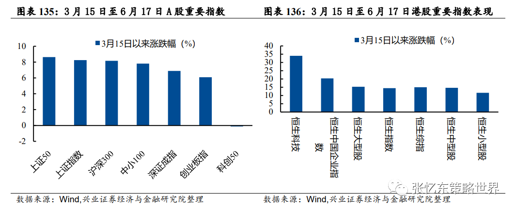 首先,自上半年低点以来,中国股市(港股和A股)反弹明显,在全球大类资产表现中靠前。自3月15日低点以来,截至6月17日,恒生指数反弹14.4%,上证指数反弹8.3%,恒生科技指数反弹了34%,在全球大类资产表现中靠前。