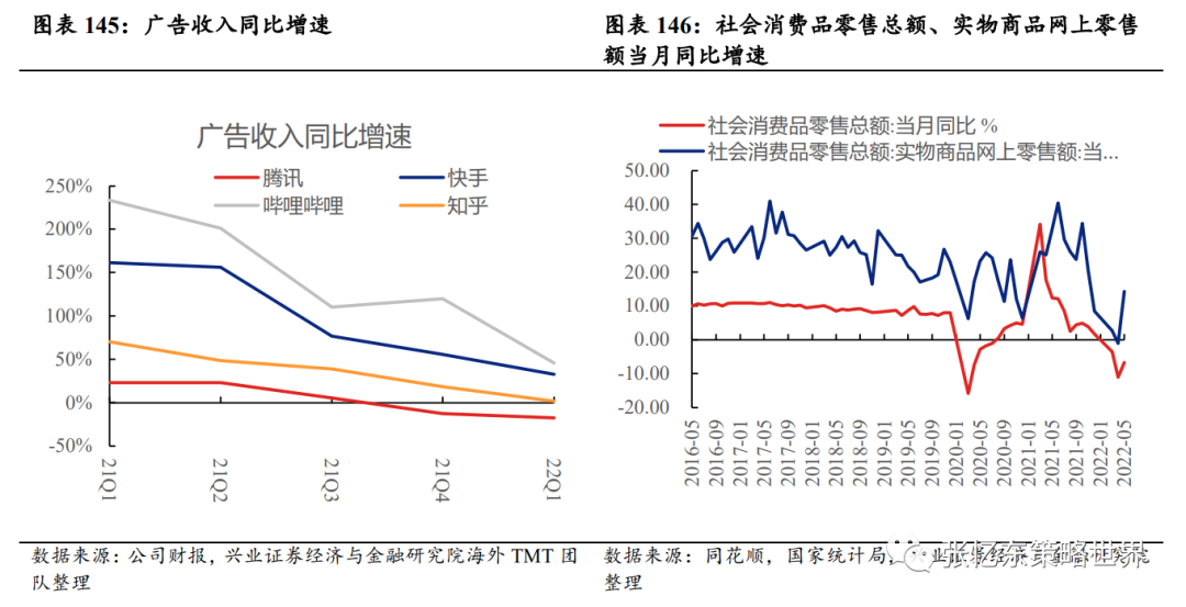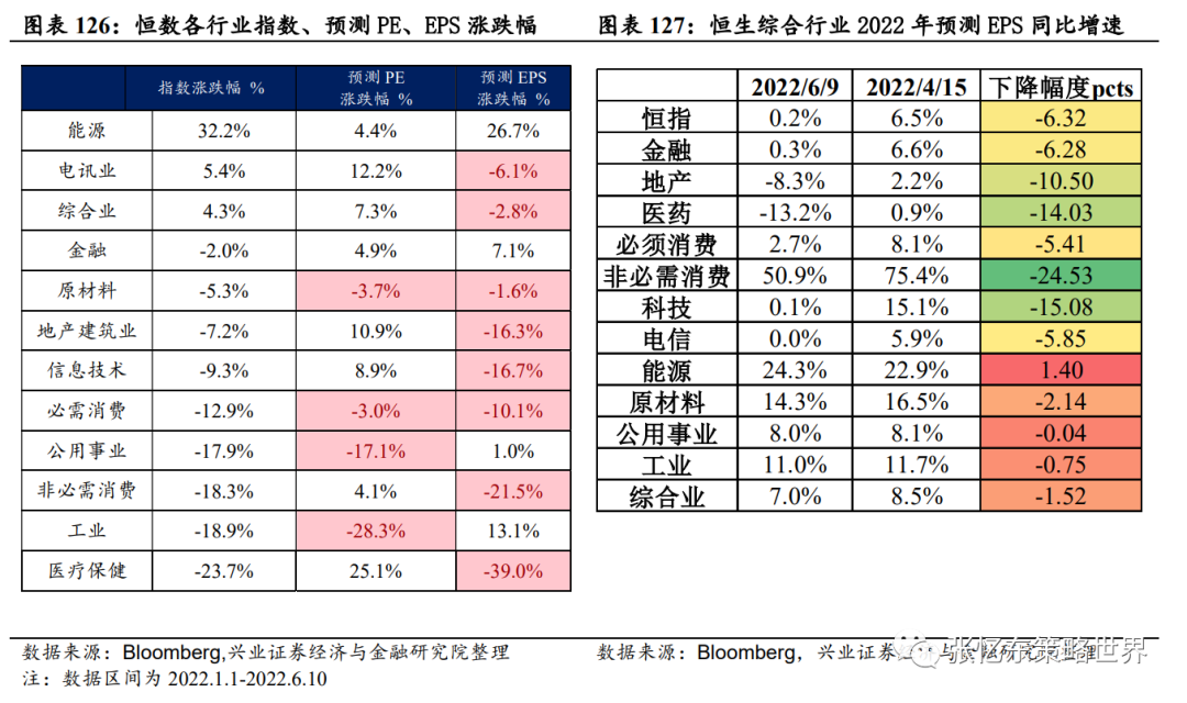 第二阶段,震荡磨底,预期改善,逐步确认市场底,等待经济底的阶段。4月1日至6月10日,恒指下跌0.9%,而估值提升5.5%,盈利下调6.0%。权重占比合计达到53.4%的金融和资讯科技公司发布了2022年一季报,其中金融2022Q1净利润同比仅增长0.4%,资讯科技净利润同比大幅下降90.6%(Non-GAAP净利润同比下降21.0%)。