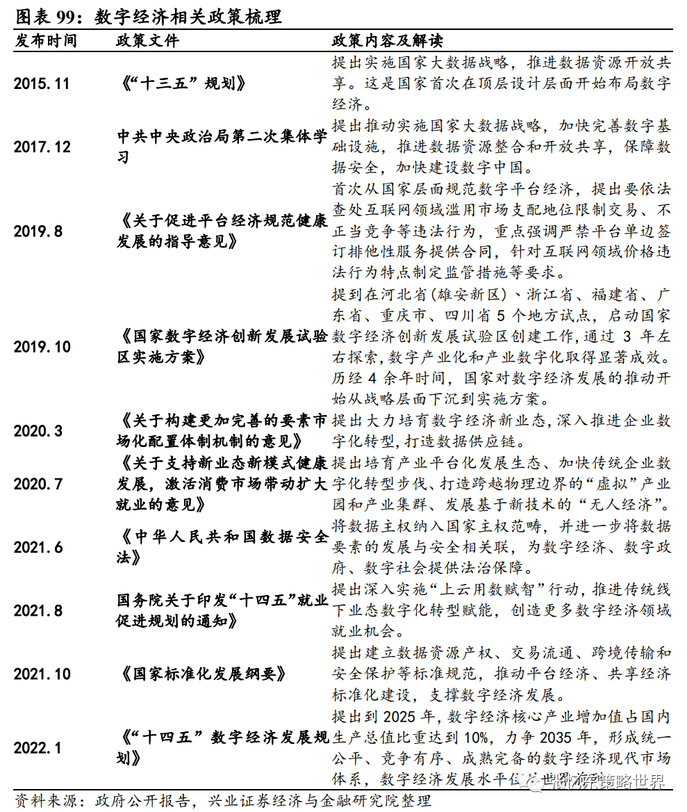 我国数字经济政策持续落地。“十四五”期间,国家支持互联网创新,推动互联网与实体经济深度融合,加快产业数字化转型,不断做大做强数字经济。2022年1月,《“十四五”数字经济发展规划》提出:到2025年,数字经济核心产业增加值占国内生产总值比重达到10%,力争2035年,形成统一公平、竞争有序、成熟完备的数字经济现代市场体系,数字经济发展水平位居世界前列。