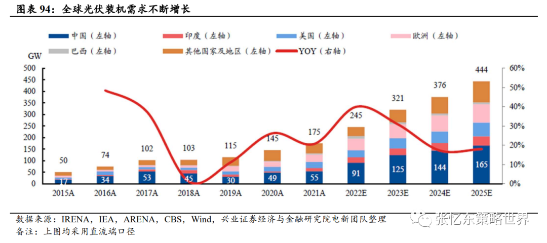 中国“十四五”期间,可再生能源发电量增量在全社会用电量增量中的占比超过50%,风电和太阳能发电量实现翻倍。《“十四五”可再生能源发展规划》: 2025年可再生能源年发电量达到3.3万亿千瓦时左右。根据兴证电新团队估计,2021-2025年全球光伏新增装机容量CAGR为25%。