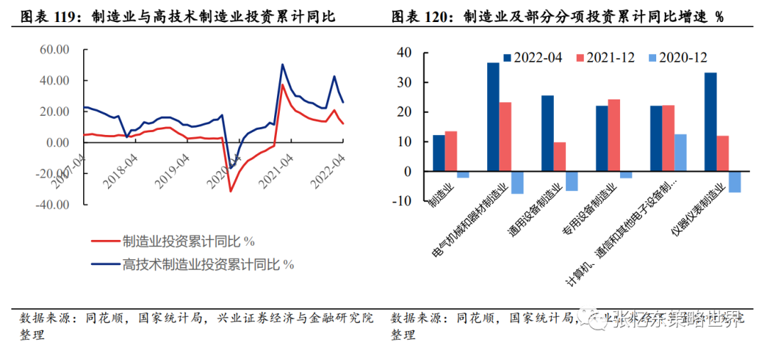 高技术制造业投资累计同比增速持续高于制造业,截至2022年4月,电气机械和器材制造业(36.6%)、仪器仪表制造业(33.3%)、通用(25.6%)专用(22.1%)设备制造业、电子设备制造业(22.1%)累计同比增速均高于制造业整体水平(12.2%)。