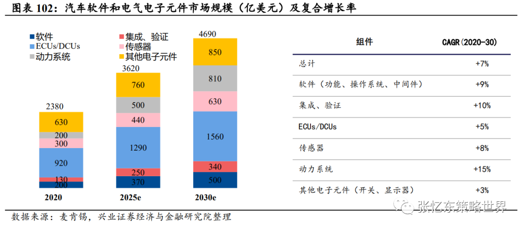 汽车软件和电气电子元件市场前景广阔。根据麦肯锡《汽车软件与电子2030》,2020年汽车软件和电气电子元件市场规模2380亿美元,占整车价值10%,其中中国市场1610亿美元,占34.3%的市场份额。