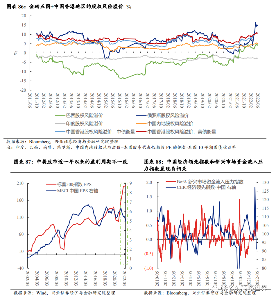 其次,下半年,在美股盈利动能回落,中国优质公司的盈利伴随着经济“弱复苏”而有望回升,从而中国股市对海外市场动荡的敏感度下降。MSCI中国 EPS在2021年年中开始高位回落,与SP500 EPS走势呈现显著背离;今年再次反过来。