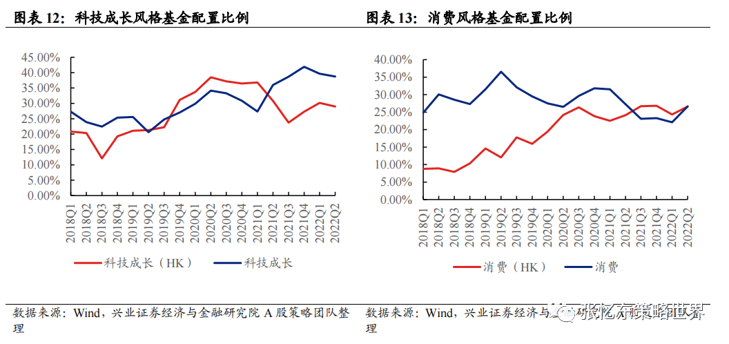 - 金融地产:A 港股金融地产风格配置变化较为同步,2020 年以来二者配置比例相对稳定。截至 2022Q2,港股金融地产配置比例为 21.8%,明显高于 A 股金融地产配置比例 6.7%。