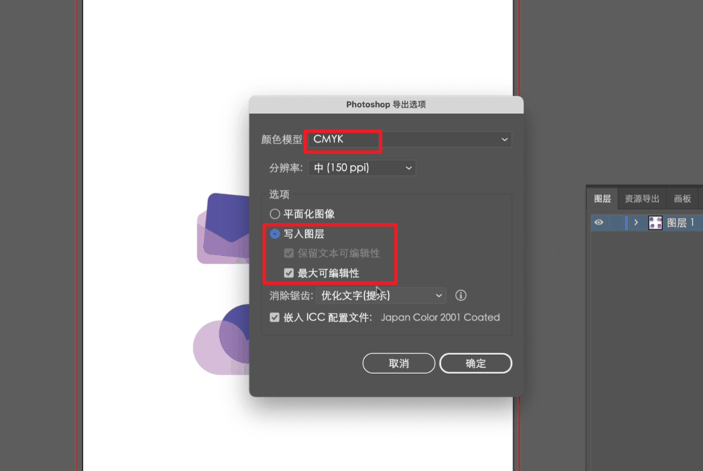 颜色模式选CMYK,并勾选写入图层和最大可编辑性,并点击确定。