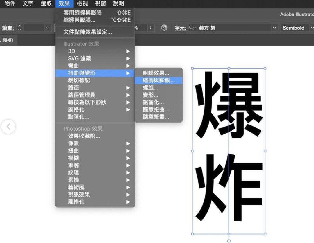 Step.2 点击上方效果→ 扭曲和变换 → 收缩和膨胀;