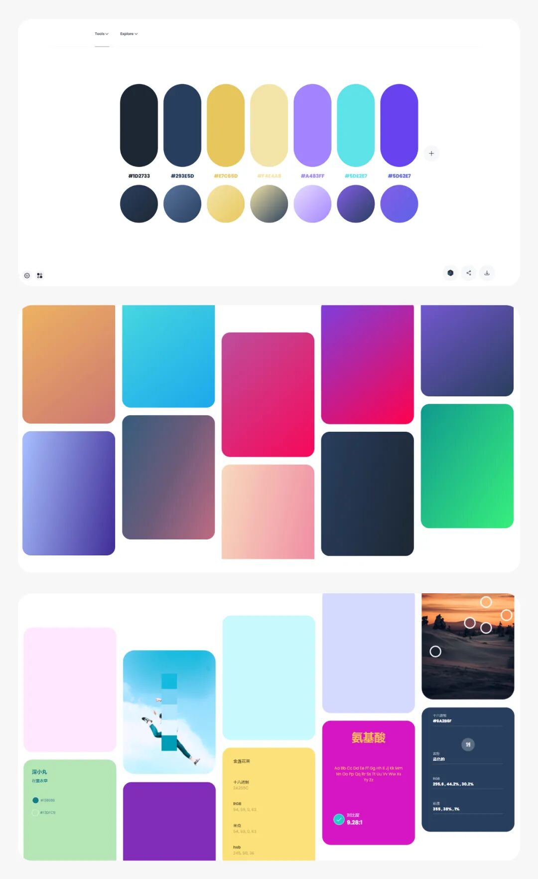 该神器包含了,调色板生成器,颜色转换器,色轮,彩色碳粉,对比度检查器,梯度发生器,颜色搅拌机,颜色提取器,在线颜色选择器,彩色百科全书,调色板探索,色彩探索,渐变探索,颜色和类型探索,颜色和图像探索,等等,基本上你需要用到配色的地方都有,功能非常强大,网址默认是英文,大家可以用浏览器自动翻译成中文阅读。支持,SVG,PDF,PNG,JPG,颜色代码,等等。文章底部获取配色神器,已给大家准备好,先看完基本的介绍,上手更快。![]()