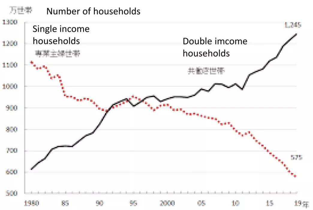 在这几十年间,女性劳动力参与率逐年增加。在长期的经济衰退下,双份收入已成为维持家庭财务的必要条件。现在,70%的日本女性在生育年龄段加入劳动力市场,在数量上超过了美国和欧盟,但几乎百分之六十的女性劳动力都在非正规条件下从事低工资工作。