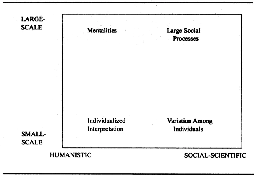 我马上想到了第二种划分。历史学家在研究规模上有很大不同——从个人到整个人类。尽管在逻辑上是独立的,但小规模/大规模和社会科学/人文的连续性关联很弱。在某种程度上,选择人文一端的历史学家也倾向于关注个人(而不是整个人类)。不过,那些强调精神和文化的、较为人文主义的历史学家(他们的数量近年来有所增加)经常在地区、国家、甚至各个大陆的规模内工作。此外,许多较为社会科学的历史学家将个别观察结果汇总成分布,然后对发现的分布采用相当个人主义的解释。我们可以用下图来表示这种划分: