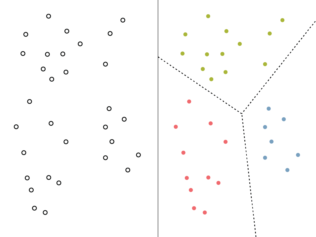 [6]k均值(k-means)算法将数据筛选成一系列的组,每个组都围绕一个中心点或均值进行聚类。输入变量,k,指的是想要的聚类数量。一个典型的实现可能如下:给定一组100个数据点,将这些点组织成四个聚类(基于一些关于相似性的假定,例如,这些点在空间上相互接近)。