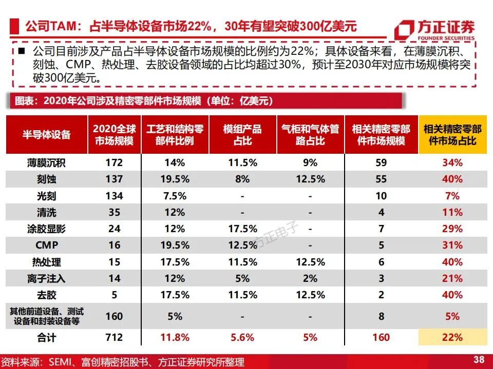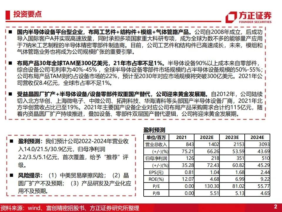 国内半导体设备平台型企业,布局工艺件+结构件+模组+气体管路产品。公司自2008年成立,后成功导入国际客户A并实现高速放量,同时承担多项国家重大科研专项,成为全球为数不多的能够量产应用于7纳米工艺制程的半导体精密零部件制造商。目前,公司工艺件和结构件已高速成长,未来,模组和气体管路业务也将成为公司规模扩张的重要引擎。布局产品30年全球TAM至300亿美元,21年市占率不足1%。半导体设备90%以上成本来自零部件,综合设备公司毛利率为40%-45% ,全球半导体设备零部件市场规模约占半导体设备规模的50%-55%;公司布局产品TAM则约占设备市场的22%,预计至2030年对应市场规模将突破300亿美元。2021年公司营收仅8.4亿元,全球市占率不足1%。受益晶圆厂扩产+半导体设备/设备零部件双重国产替代,公司迎来黄金发展期。自2012年,公司陆续切入北方华创、上海微电子、中微公司、拓荆科技、华海清科等头部国产半导体设备厂商,2021年北方华创营收占比已至19%。2021年主要国产设备企业对应公司布局产品采购需求合计约115亿元,随着内资晶圆厂扩产持续推进,叠加设备、零部件双层国产替代逻辑,公司将迎来黄金发展期风险提示:(1)中美贸易摩擦风险;(2)晶圆厂扩产不及预期;(3)产品研发及产业化应用不及预期。