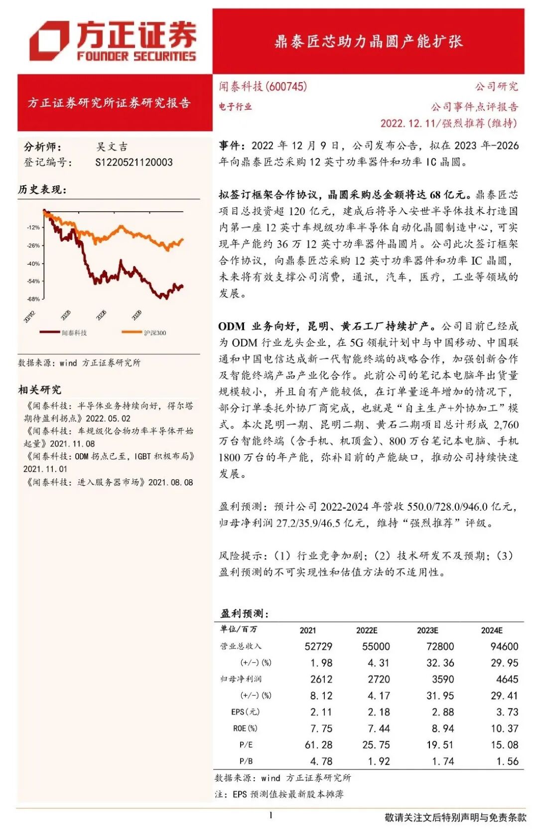 事件:2022年12月9日,公司发布公告,拟在2023年-2026年向鼎泰匠芯采购12英寸功率器件和功率IC晶圆。拟签订框架合作协议,晶圆采购总金额将达68亿元。鼎泰匠芯项目总投资超120亿元,建成后将导入安世半导体技术打造国内第一座12英寸车规级功率半导体自动化晶圆制造中心,可实现年产能约36万12英寸功率器件晶圆片。公司此次签订框架合作协议,向鼎泰匠芯采购12英寸功率器件和功率IC晶圆,未来将有效支撑公司消费,通讯,汽车,医疗,工业等领域的发展。ODM业务向好,昆明、黄石工厂持续扩产。公司目前已经成为ODM行业龙头企业,在5G领航计划中与中国移动、中国联通和中国电信达成新一代智能终端的战略合作,加强创新合作及智能终端产品产业化合作。此前公司的笔记本电脑年出货量规模较小,并且自有产能较低,在订单量逐年增加的情况下,部分订单委托外协厂商完成,也就是“自主生产+外协加工”模式。本次昆明一期、昆明二期、黄石二期项目总计形成2,760万台智能终端(含手机、机顶盒)、800万台笔记本电脑、手机1800万台的年产能,弥补目前的产能缺口,推动公司持续快速发展。盈利预测:预计公司2022-2024年营收550.0/728.0/946.0亿元,归母净利润27.2/35.9/46.5亿元,维持“强烈推荐”评级。风险提示:(1)行业竞争加剧;(2)技术研发不及预期;(3)盈利预测的不可实现性和估值方法的不适用性。![]()
