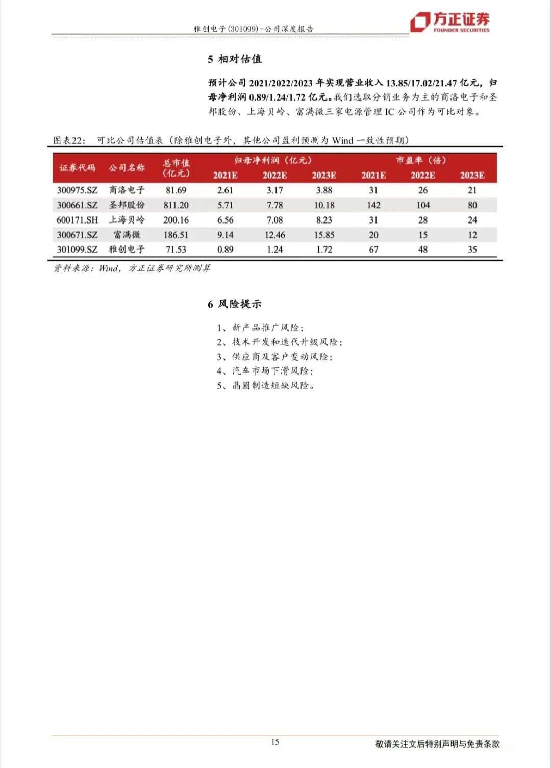 一汽、大众等知名终端车厂,客户资源优势明显,未来随汽车半导体行业增长,公司分销业务有望继续稳定增长。4. 收购标的贡献业绩,业务协同未来可期。公司收购标的怡海能达2022年2-9月实现营业收入为2.71亿元,实现归母净利润0.10亿元。公司收购标的欧创芯于2022年8月26日并表,亦为公司贡献部分业绩。未来随公司与收购标的业务协同逐渐深化,收购标的有望凭借公司客户资源优势及渠道优势快速发展。 盈利预测:我们预计2022-2024年,公司营业收入将达到22.6/31.9/42.3亿元,归母净利润1.8/2.8/4.2亿元,维持“推荐”评级。风险提示: (1)新产品推广风险; (2)技术开发和迭代升级风险;(3)供应商及客户变动风险;(4)汽车市场下滑风险;(5)晶圆制造短缺风险;(6)商誉减值的风险。![]()