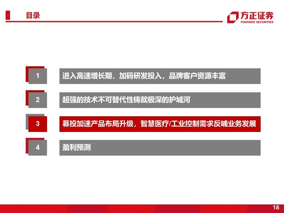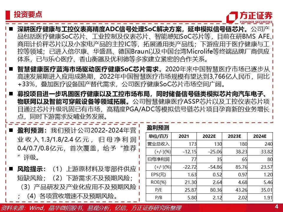 募投项目进一步巩固医疗健康以及工控市场布局,同时储备信号链类模拟芯片向汽车电子、物联网以及智能可穿戴设备等领域拓展。公司智慧健康医疗ASSP芯片以及工控仪表芯片项目通过芯片升级巩固已有市场,高精度PGA/ADC等模拟信号链芯片项目孕育新的业务增长点,同时下游需求反哺业务发展。