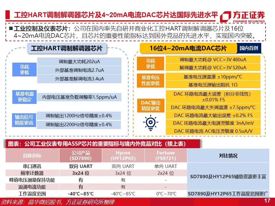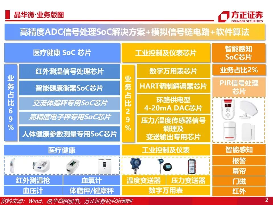 深耕医疗健康与工控仪表高精度ADC信号处理SoC解决方案,延申模拟信号链芯片。公司产品包括医疗健康SoC芯片、工业控制及仪表芯片、智能感知SoC芯片等,目前在研BMS AFE、商用计价秤芯片以及小家电产品的主控IC等,拓展通用类产品线;下游应用于医疗健康与工控等领域;已进入倍尔康、华盛昌、德国Braun以及中国台湾Microlife等终端品牌厂商供应体系,已与乐心医疗、香山衡器及优利德等多家建立紧密的合作关系。