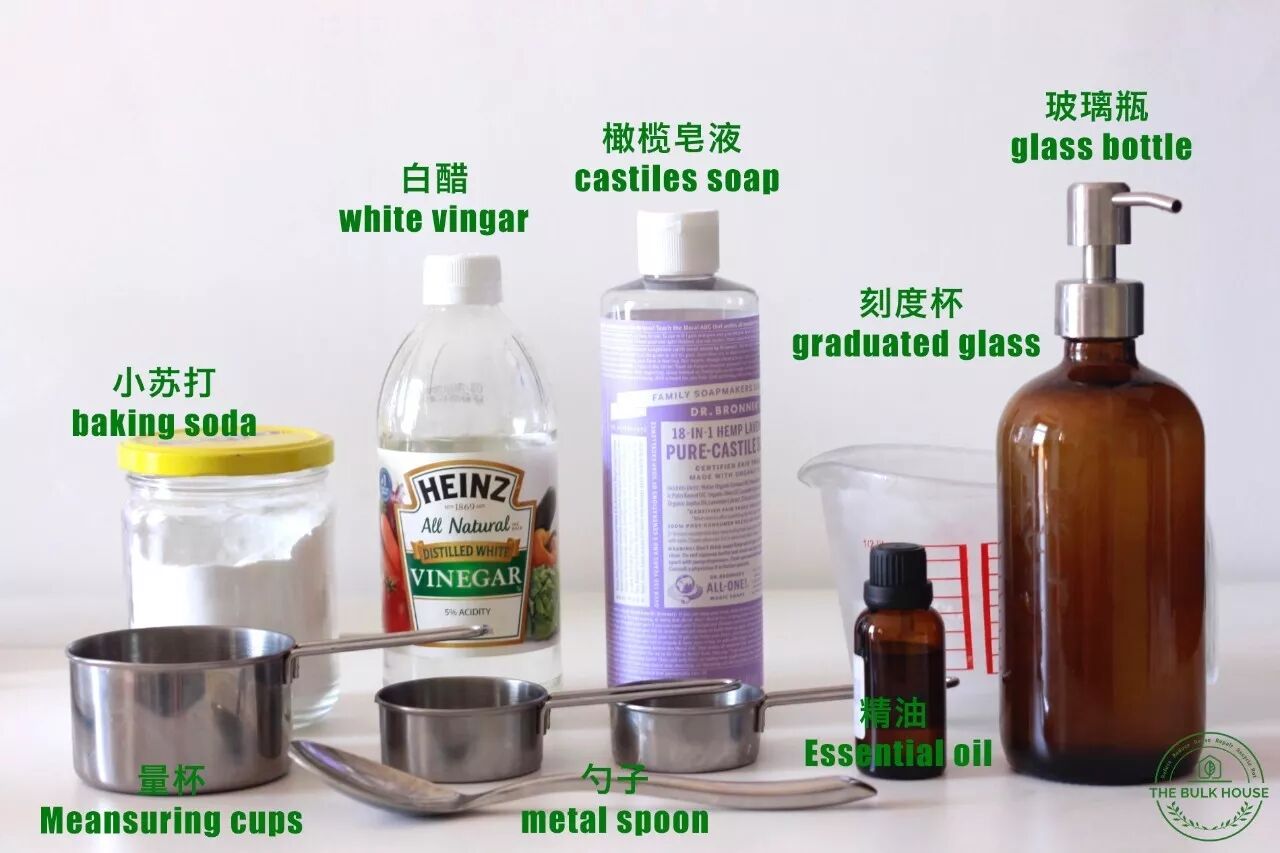 香皂液 (我用的是Dr Bronner's的皂液,很多在践行零浪费生活的博主常提到这个品牌)