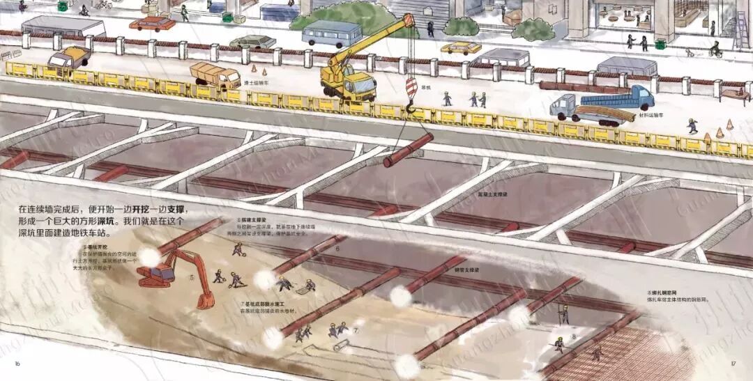 在连续墙完成后,便开始一边开挖一边支撑,形成一个巨大的方形深坑。我们就是在这个深坑里面建造地铁车站。