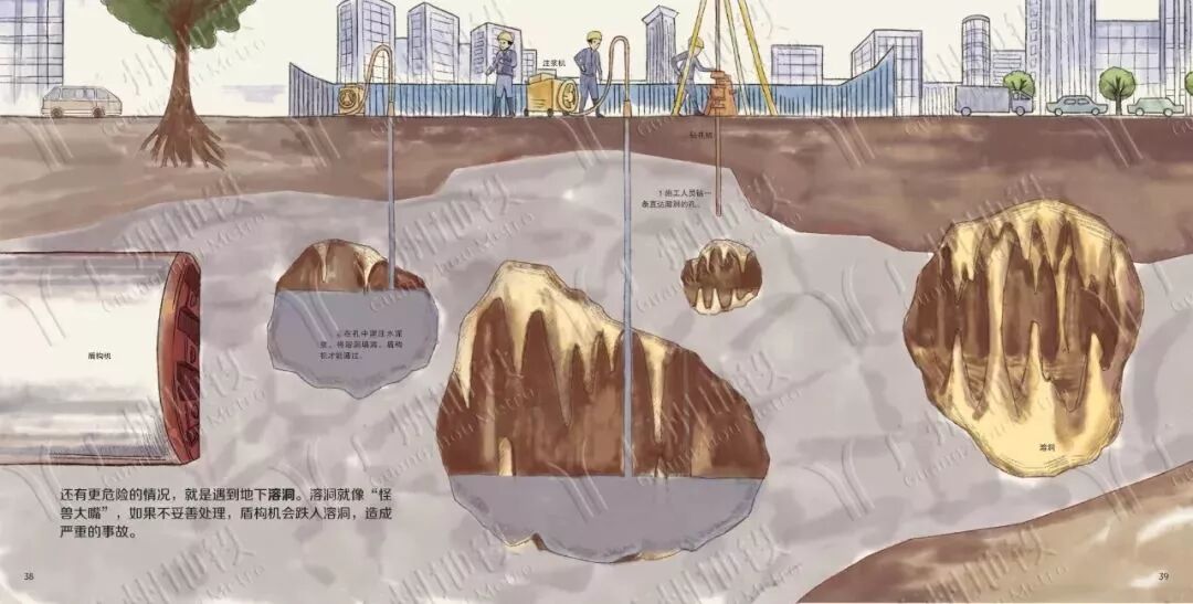 还有更危险的情况,就是遇到地下溶洞。溶洞就像“怪兽大嘴”,如果不妥善处理,盾构机会跌入溶洞,造成严重的事故。