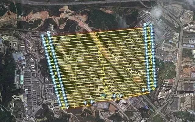 当多镜头倾斜摄影无人机飞行到适当高度以后,机载的倾斜摄影系统从多个视角向地面航摄,航拍路线采用重叠率60~80%(由地面高度决定)沿某一方向来回往返,呈带状按次序逐步覆盖全部场地,实现对地形逻辑有序的全覆盖航摄。