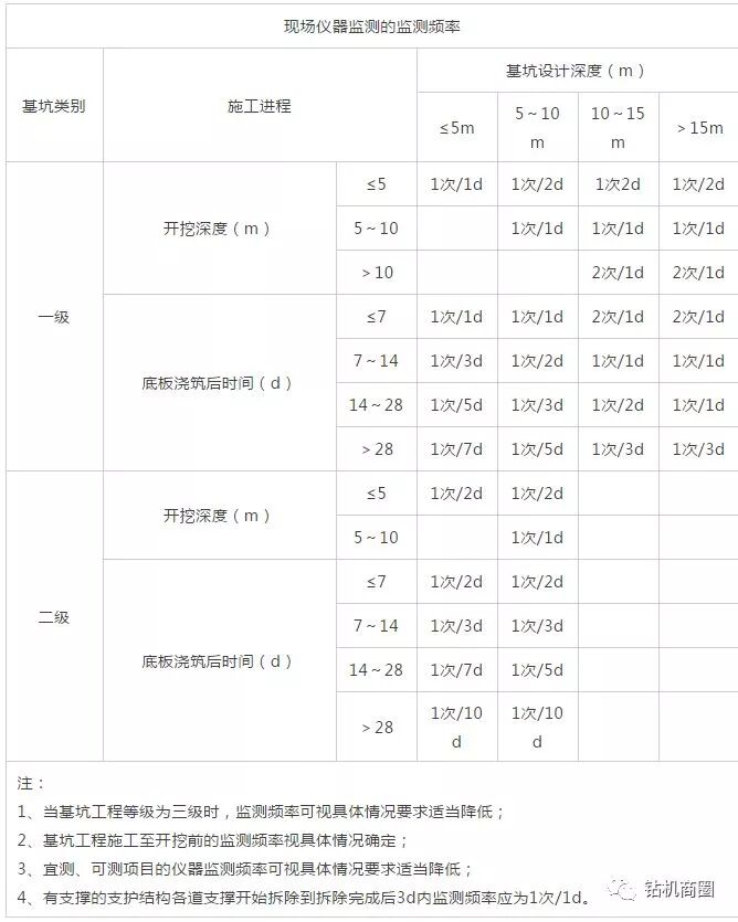 2、监测项目的监测频率应综合考虑基坑类别、基坑及地下工程的不同施工阶段以及周边环境、自然条件的变化和当地经验而确定。当监测值相对稳定时,可适当降低监测频率。对于应测项目,在无数据异常和事故征兆的情况下,开挖后现场仪器监测频率的确定可参表B.11.7。(GB50497-2009第7.0.3条)