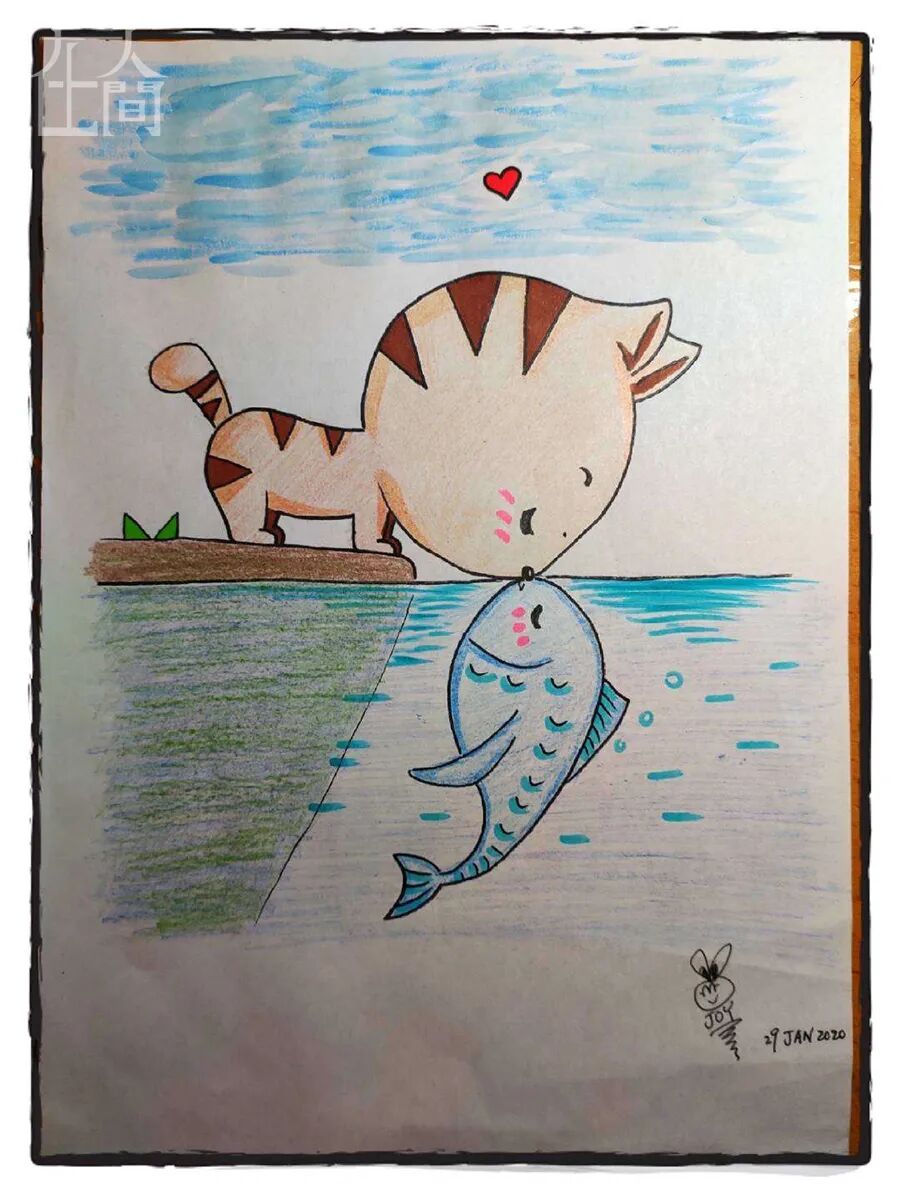 ■ 这天,我跟孩子一起上网课时,画的《猫咪的朋友》。那时,我内心充满了希望。