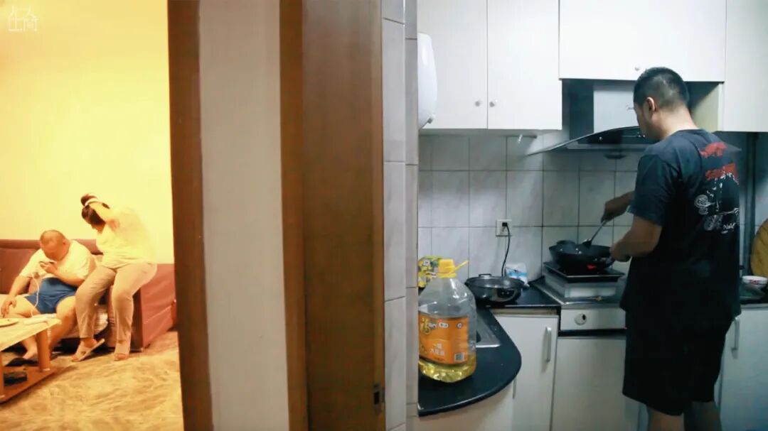 斯博在和浩哥租住的住房里给浩哥和助理下厨做饭
