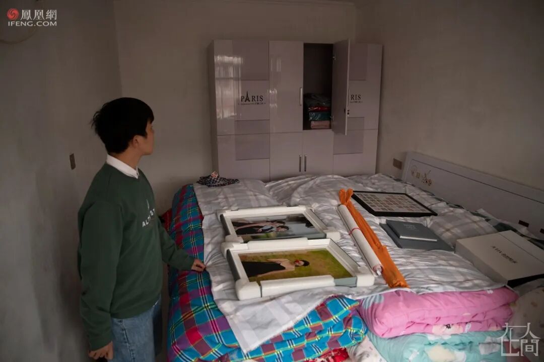 北苏村李鹏辉的新房里有一张床、一个衣柜、一个化妆台。一组刚刚拍摄的婚纱照还没来得及挂到墙上。窗口边的化妆台上摆满喜糖和红包封。“家具是前天刚买的”,李鹏辉说。