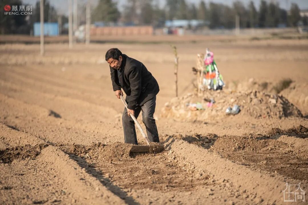 蒋进勇和儿子蒋军磊在刚下了小麦种的土地上挖水沟的时候,蒋进勇父亲蒋凌云坟上的彩纸在他们劳作的身影后闪着白光。彩纸旁边种着一棵树苗,一根光杆上冒出几颗新芽。如果没有彩纸和小树,在刚犁过的田野里不容易发现那是个低矮的新坟。