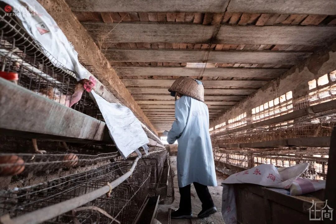 10月23日,魏志头上顶着箩筐在南侧鸡舍中干活,天花板上的砖头随时可能掉落。