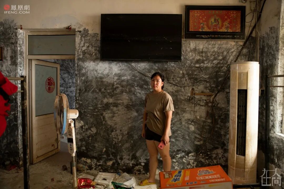 厨房的灶台被水泡塌已经被拆掉了,灶台上方被烟熏黑的墙上挂着锅铲汤勺。她的厨房已经被搬空了,一日三餐都是去亲戚家吃。