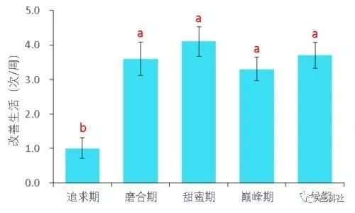 约会吃饭是两人相识至今必不可少的,追求期两人平均每周在外就餐1次,恋爱后在外就餐次数显著增加,且磨合期、甜蜜期、巅峰期、守候期这四阶段,每周在外就餐次数无显著变化(P > 0.05),分别3.6,4.1,3.3和3.2 次/周。![]()