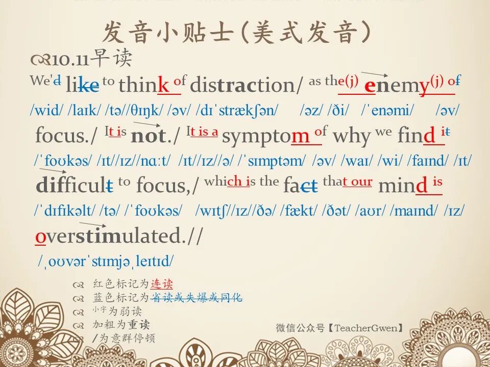 1. the(j) enemy(j) of focus 注意词间元元连读和同化现象;