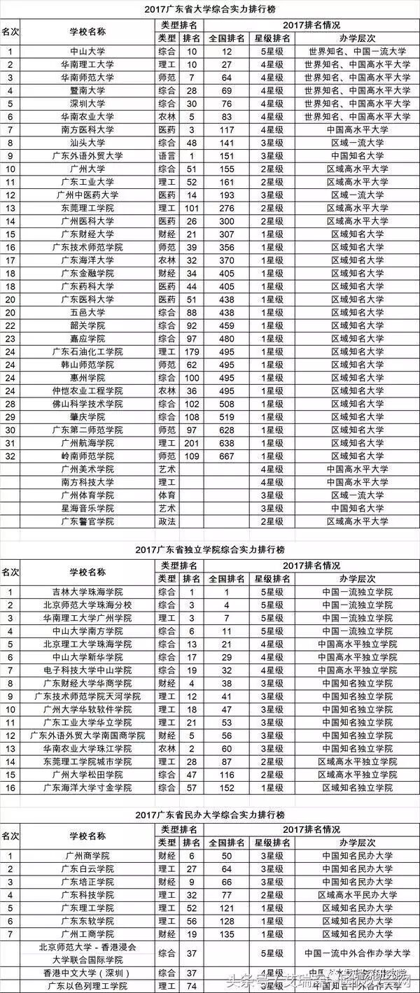 在最新2017中国大学排行榜700强中,中山大学全国排名第12,雄居艾瑞深中国校友会网2017广东省大学综合实力排行榜冠军,荣膺2017中国五星级大学美誉,跻身世界知名、中国一流大学行列;荣登国际公认的2017英国QS、泰晤士报和美国新闻与世界报道等三大世界大学排行榜500强,稳居2017年中国大学世界排名最高的“九校集团(G9集团)”。华南理工大学第2,华南师范大学第3,暨南大学第4,深圳大学第5。吉林大学珠海学院、北京师范大学珠海分校、华南理工大学广州学院名列2017广东省独立学院综合实力排行榜前3强。广州商学院、广东白云学院、广东培正学院名列2017广东省独立学院综合实力排行榜前3强。其中,南方医科大学是未来几年内广东省最有实力冲击全国100强的高校。