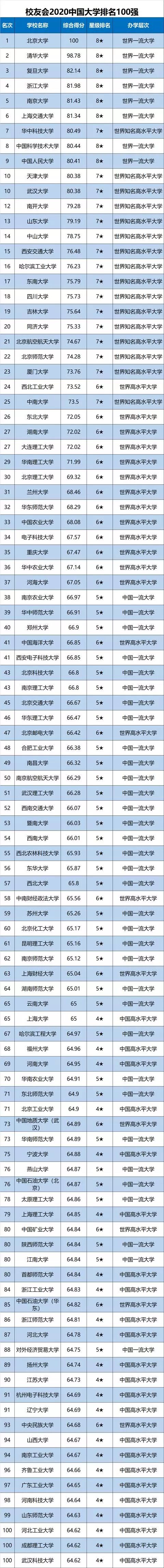 在最新2020中国大学星级排名中,北京大学、清华大学、中国人民大学、复旦大学、浙江大学、南京大学、上海交通大学、中国科学技术大学、国防科技大学和中国科学院大学等10所高校荣膺2020中国八星级大学(8★)美誉,晋升世界一流大学行列。武昌首义学院、文华学院、山东英才学院、西安欧亚学院和三亚学院位列2020中国民办大学排名前5名。吉林大学珠海学院、云南师范大学商学院、四川大学锦江学院、武汉科技大学城市学院和中山大学南方学院名列2020中国独立学院排名前5强。