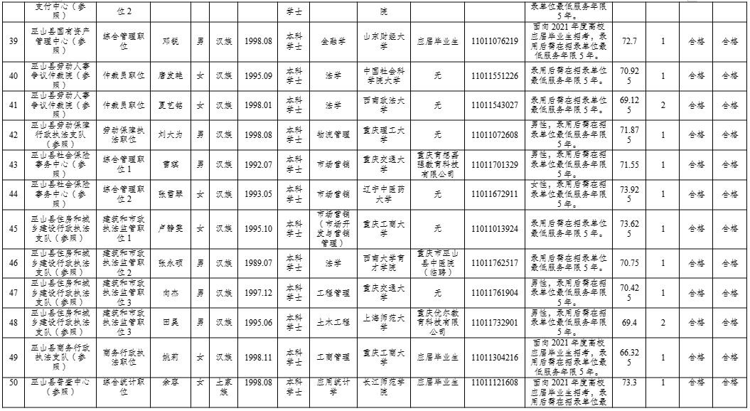 附件:巫山县2021年度公开考试录用公务员拟录用人员公示表
