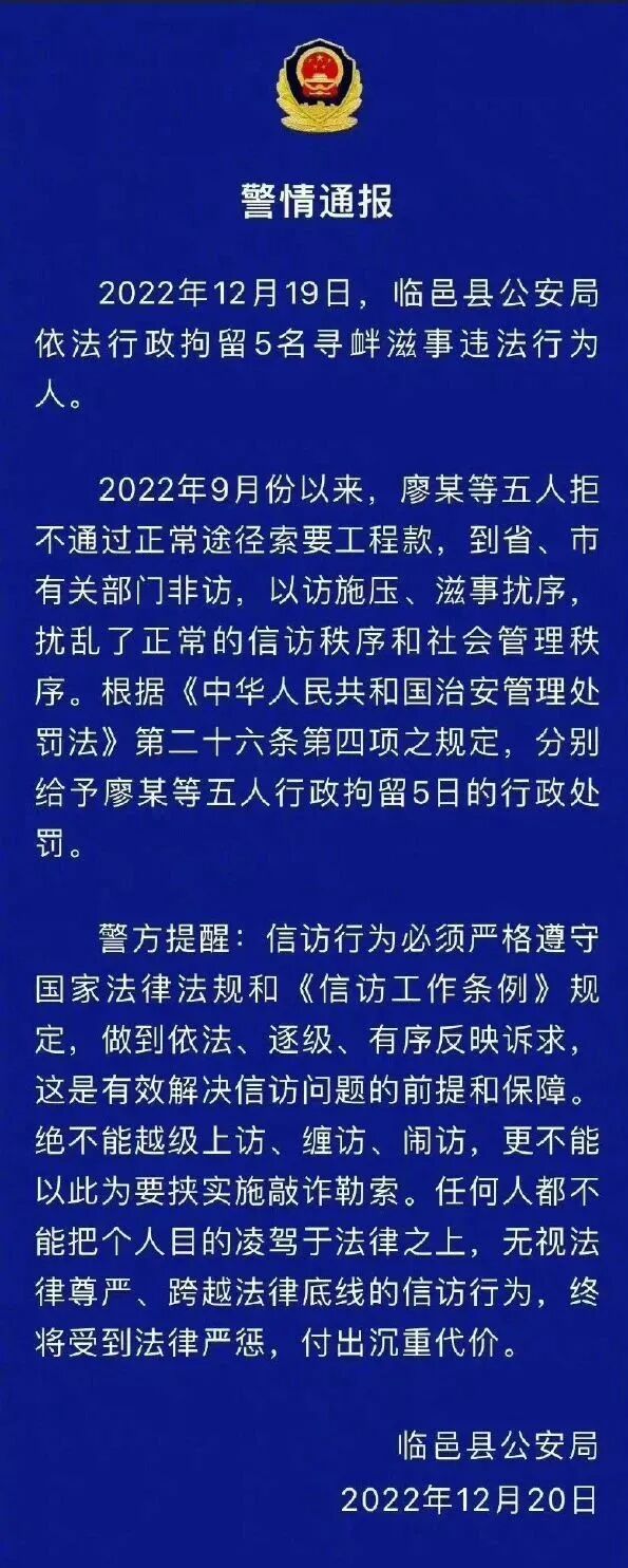 春节临近,年终岁尾,有不少农民工辛苦了一年,正盼着拿上工钱回家过年。临邑公安的这段话,看似提醒,更像是在警告:你们这些人,讨薪时老实点儿,信访时小心点儿,否则吃不了兜着走!