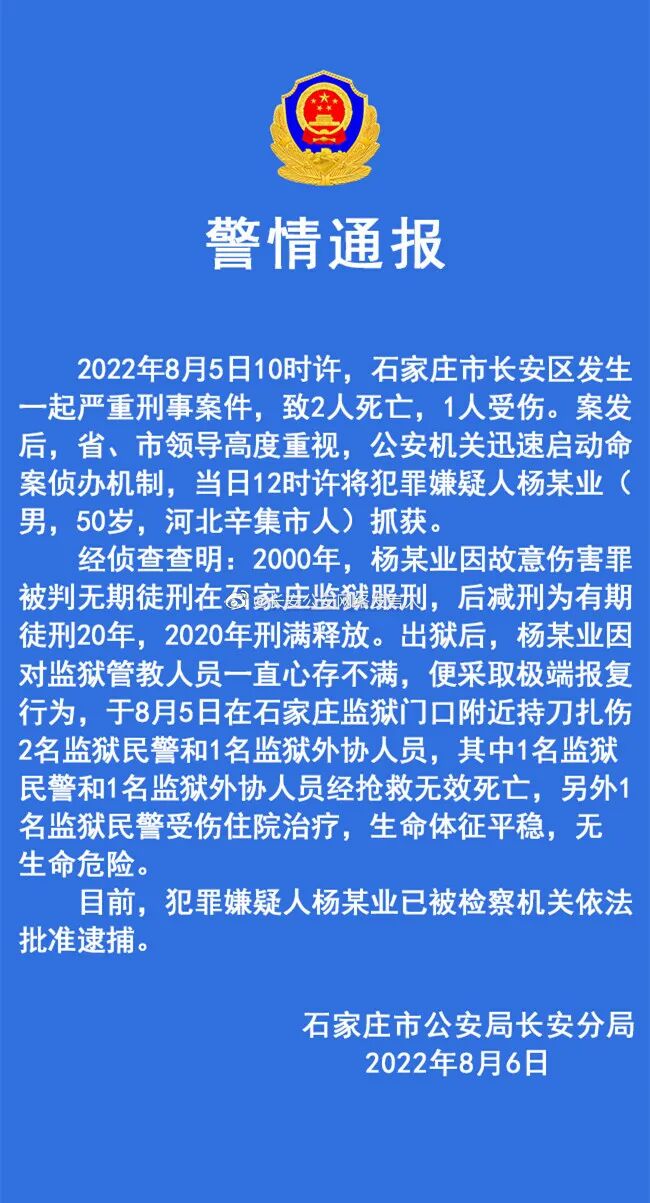 ■ 5日上午10时许,石家庄市长安区发生一起持刀伤人案件,致2人死亡,1人受伤。警方通报案件详情,嫌犯刑满释放后报复监狱管教人员,目前已被检察机关依法批准逮捕。(详情)■ 5日下午,青岛市中级人民法院发布悬赏通告,最高奖励1257万元。(详情)
