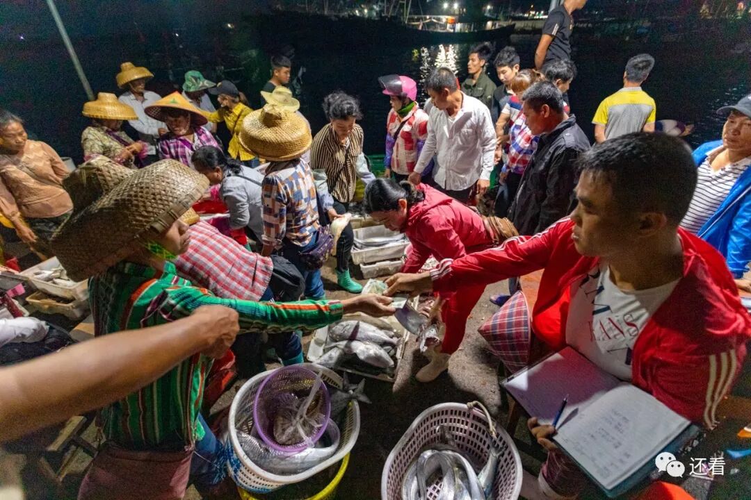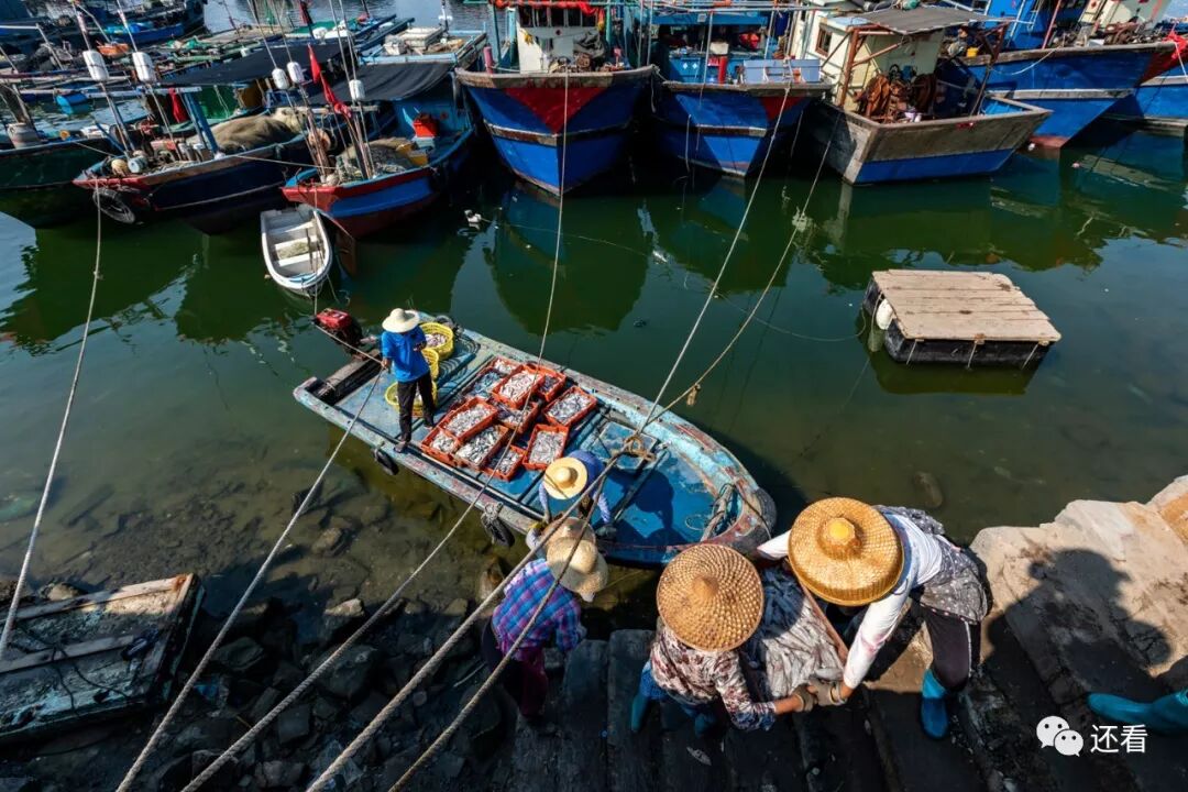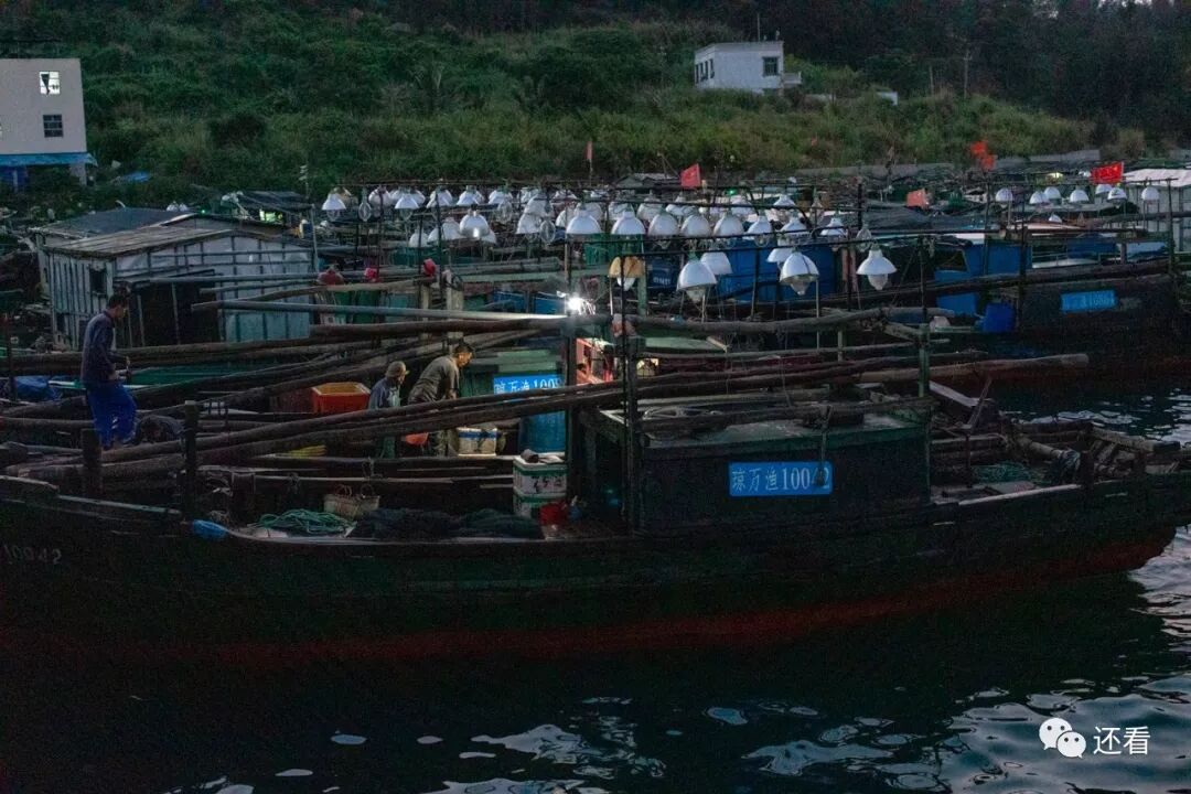 小灯光渔船是这里渔民主要的生计工具。凌晨五点,辛劳一夜的渔船靠港,船工就着微光在整理渔获。