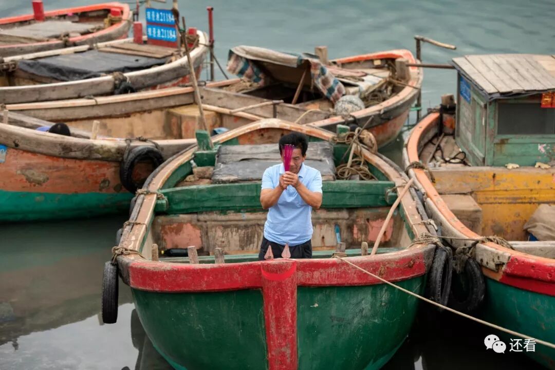 庙堂之外,港口边。渔民们备好祭品,在自家的小船上做“挂红”仪式。
